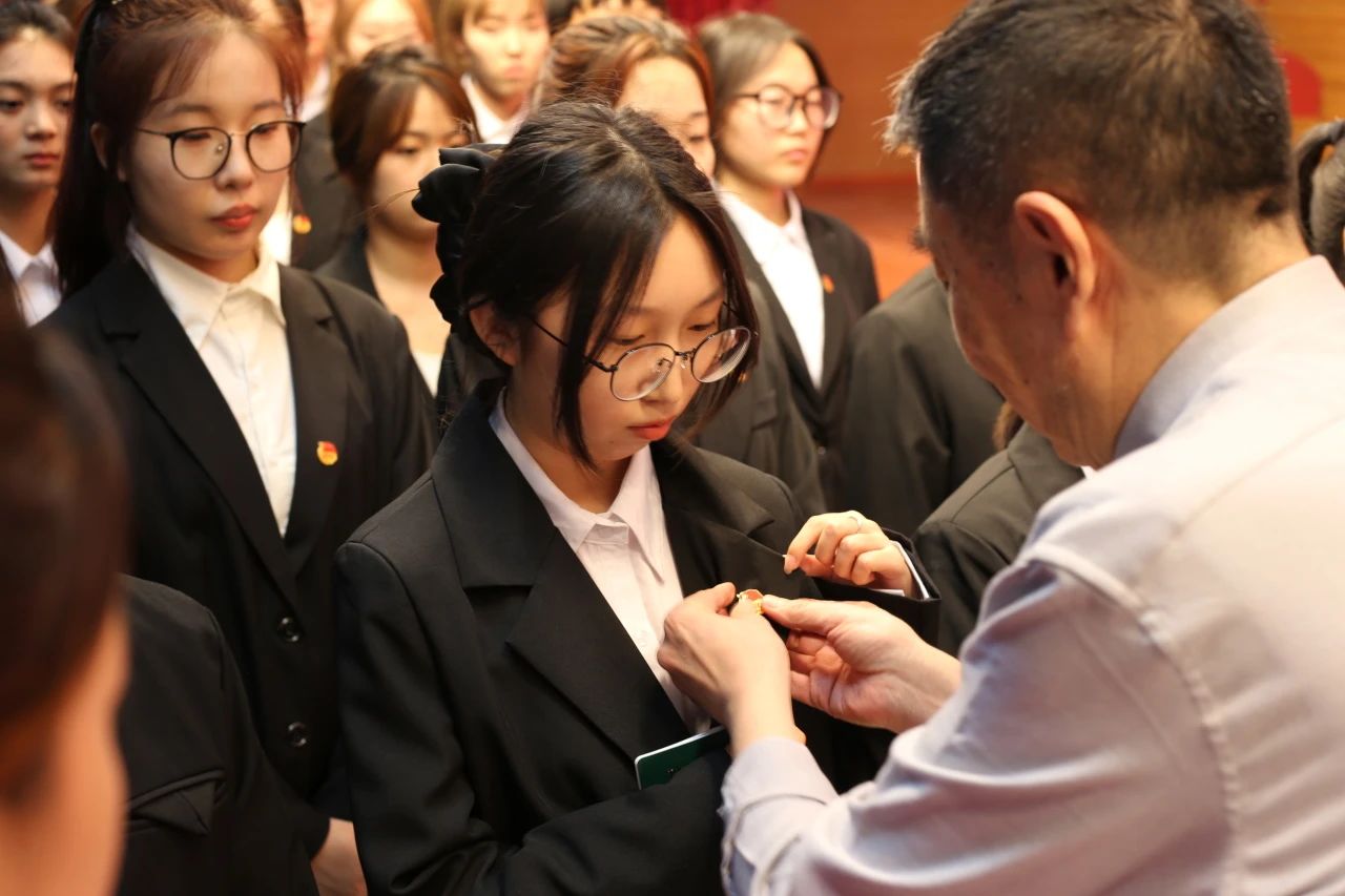 党委书记周宏为新团员佩戴团徽并颁发团员证。