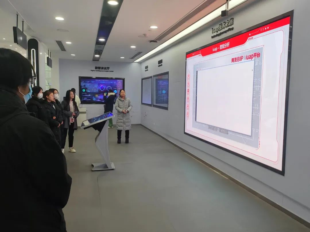 在用友企业园工作人员的引导下,师生们参观了用友的数智体验馆。体验馆内,最新的数字化技术和解决方案生动展示了企业如何通过技术创新来提升效率和竞争力。师生们亲身体验了各种前沿技术,对数字化工作环境有了更直观的认识。