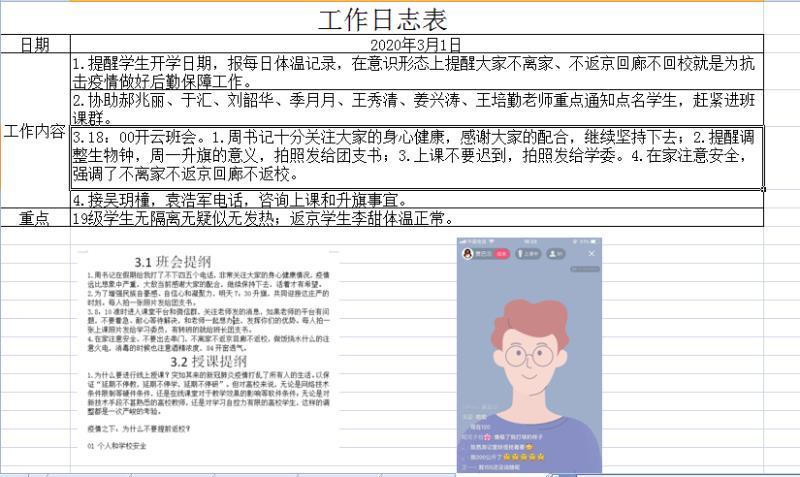 自1月23日疫情发生以来,学工处密切关注,积极部署疫情防控工作和学生管理应急管理工作,严格按照学校工作部署,做好疫情期间的学生思想、心理健康、就业指导等工作,相继出台《新冠肺炎防控知识手册》和《讲述防疫抗疫一线的感人故事》、《人民战疫党旗飘扬》、《关爱生命健康-大学生防疫常识》学生思想教育、战疫防疫知识等班会提纲课件。要求辅导员要动态掌握本班每一个学生健康状况并建立档案,落实防控日志,准确掌握学生每日身体健康状况、密切接触人员情况、外出出行情况等。