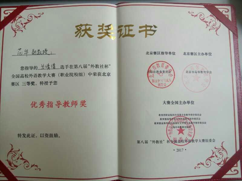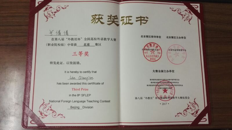 比赛参赛选手众多,竞争激烈。经过激烈角逐,我校文化与传媒学院英语教研室兰倩倩老师凭借其流利的英语口语、精心的课堂设计、过硬的临场反应能力得到三等奖第二名的好成绩,与二等奖仅1分之隔。英语教研室主任范华副教授获得指导教师奖。大赛主要考察选手的语言基本功、教学基本功、教学思辨力,从教学内容、教学过程、教学效果及综合素质四大方面进行采分。北京市高校英语教师同台竞技,更加锻炼了我院英语教师的教学能力,领略到更加先进的教学方法和教学理念,为今后我院外语教学的进一步提高打下坚实的基础。