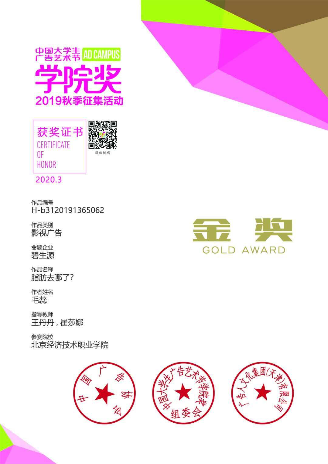 2020年3月2日中国大学生广告艺术节学院奖(简称“学院奖”)在其官方网站公布了获得荣誉作品名单,我院毛蕊同学披荆斩棘战胜两千多所高校研究生、本科生学子,作品《脂肪去哪了》在数十万件设计作品中拖影而出荣获金奖殊荣。指导老师为王丹丹、崔莎娜老师。该作品以优秀的创意和深刻的洞察赢得评委的高度肯定。由于疫情原因,本届学院奖颁奖典礼将延期举办。