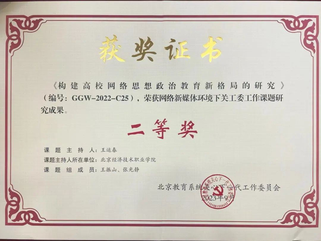 我院张宇、田琴、胡静微、庄恒辉课题组的《在网络新媒体环境下大学生心理特点、思维方式、价值观变化的深入研究》获评B类课题,纳入北京市委教育工委宣教处、 组织一处课题项目中进行立项。王运春、王振山、张光静课题组的《构建高校网络思想政治教育新格局的研究》获评C类课题。