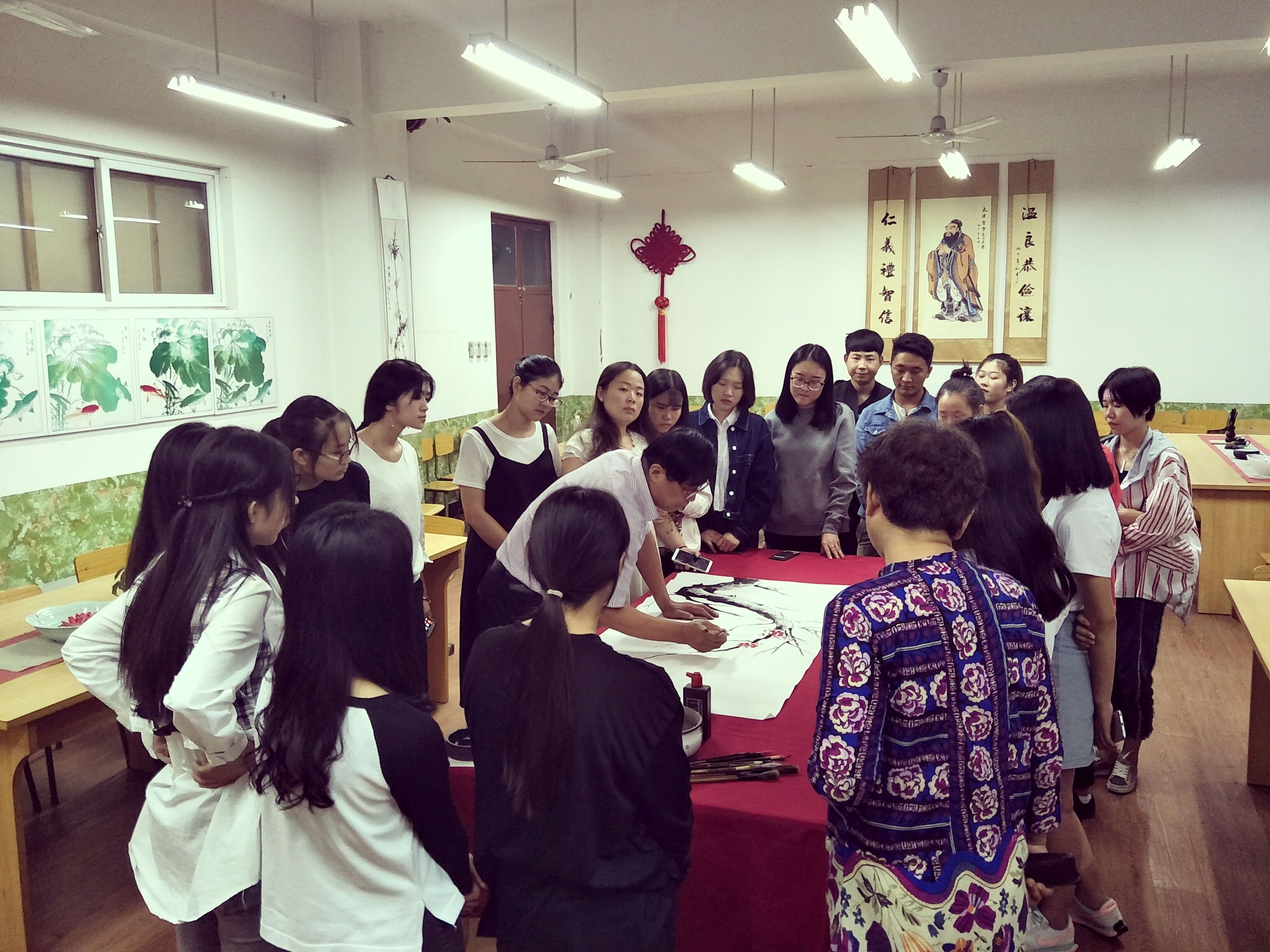 最后,孙教授题词落章,为此次授课画下了圆满的句号。同学们纷纷拿起手机记录下精彩的落笔瞬间,并和孙教授合影留念。“不经一番寒彻骨,怎得梅花扑鼻香”,相信好女子学堂的姑娘们在国画的世界里都能收获一缕芬芳。