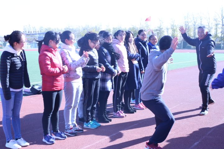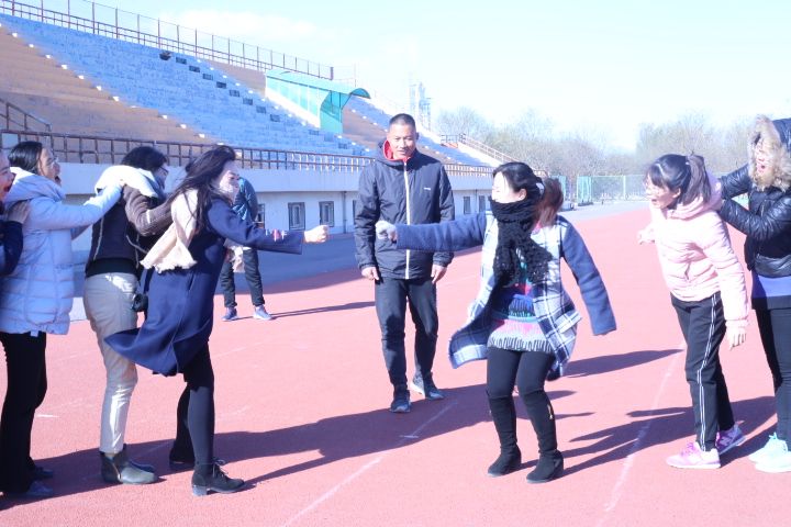 活动开始,在陈老师的指导下,全体成员组成四列队伍,由陈老师带领大家做小游戏——“老师说”,旨在打破坚冰,初步使老师们树立起团结意识和团队精神。“老师说”的游戏是指大家手挽手,听从陈老师的口令,如“向前跳”、“向后跳”、“向左跳”、“向右跳”,在第一环节中大家都能够完成陈老师的指令,口令洪亮,队伍整齐;紧接着难度加大,大家要喊出与陈老师一致的口令,动作却要与之相反,这时队形开始有一点乱;最高难度级别是,陈老师喊口令,大家喊出相反的口令,但是做出与自己口令相反的动作,通过“老师说”这一个趣味性的游戏调动了热情,提高了大家参与此次活动的兴趣,缓解了游戏中的紧张气氛。