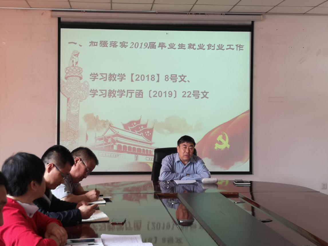 我院2019年5月15日在学院二楼会议室紧急召开2019届毕业生就业创业促进会。会议由院长助理张国强主持,学院党政办、教务处、学工处、保卫处、各二级学院院长、副院长以及毕业班班主任参会。学院领导高度重视此次会议,会上学院党总部书记周宏书记对2019届毕业生就业创业工作做了重要指示,要求各学院一定要加强落实2019届就业创业的工作,并认真学习了教学{2018}8号文,学习教学厅函{2019}22号文,就当前就业形势,传达会议精神。