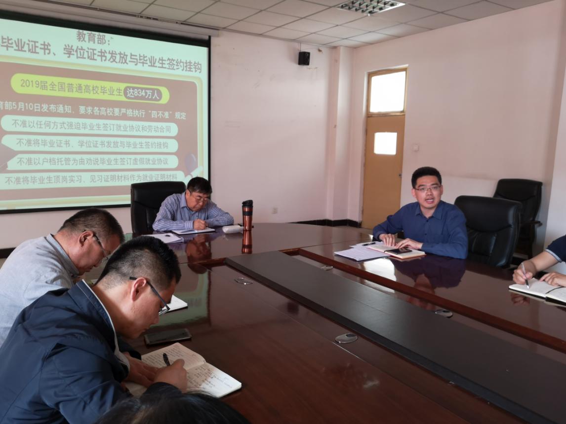 学院常务副院长李润坤就高校毕业生就业创业视频会议提出重点并要求:做好2019届毕业生工作同时执行教育部的“四不准”,强调各学院:即不准以各种方式强迫毕业生签订就业协议书和劳动合同;不准将毕业证书、学位证书发放与毕业生签约挂钩;不准以户档托管为由劝说毕业生签订虚假就业协议;不准将毕业生顶岗实习、见习证明材料作为就业证明材料。