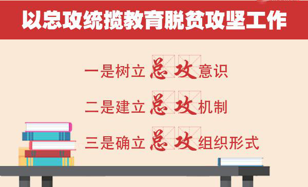 三是确立总攻组织形式。要把机关和直属单位的力量凝聚起来,把直属高校的力量展示出来,把全教育战线的力量发挥出来,把社会力量动员起来,分割包围、协同作战、聚而歼之地打好教育脱贫攻坚总攻战。