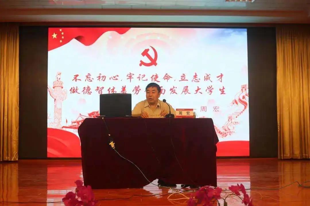 周宏书记为同学们讲述了什么是共产党人的初心和使命,以及作为一名大学生如何不辜负祖国、社会、家庭的希望,不负最好的青春年华。他希望同学们面对学业要有远大目标,要坚持奋斗,勇于创新,学会学习,善于学习,学业有成,立志成才!要按照习总书记要求“立鸿鹤志,做奋斗者”“惜时如金,孜孜不倦”“求真学问,炼真本领”。